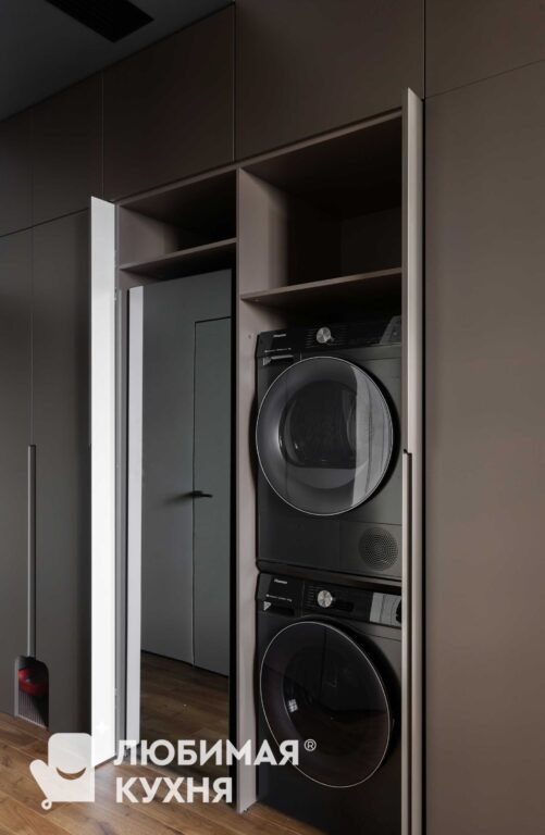 Кухня вне времени: Искусство утонченного минимализма.В этой кухне царит атмосфера утонченного минимализма, где каждый элемент продуман до мелочей. Серые матовые фасады шкафов создают монолитное пространство, сливаясь с фоновой плиткой под мрамор с выразительными прожилками. Акцент делается на подвесном модуле над рабочей зоной, выполненном с четкой вертикальной фрезеровкой, напоминающей строгий шрифт или ритмичный рисунок. Центральным элементом, вносящим в интерьер нотку природной текстуры, выступает кухонный остров. Черный смеситель с лаконичным изгибом идеально гармонирует с рабочей поверхностью и встроенной техникой.