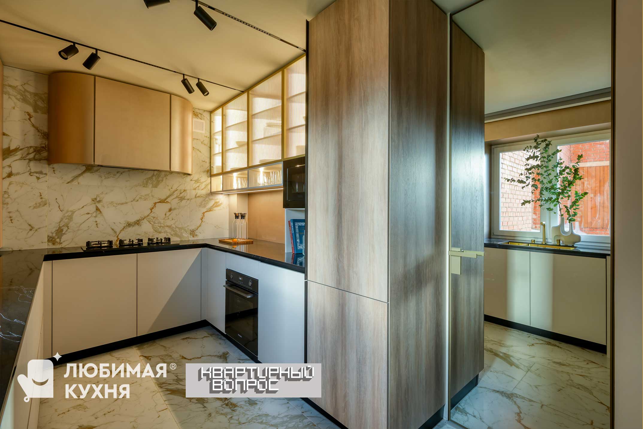 Рисунок мрамора с живописными прожилками называется Creamy Pie, Сливочный пирог — запустим и на кухонный фартук. Для удобства укладки по нижней линии закрепили профиль, он не дает тяжелым плитам сползать.