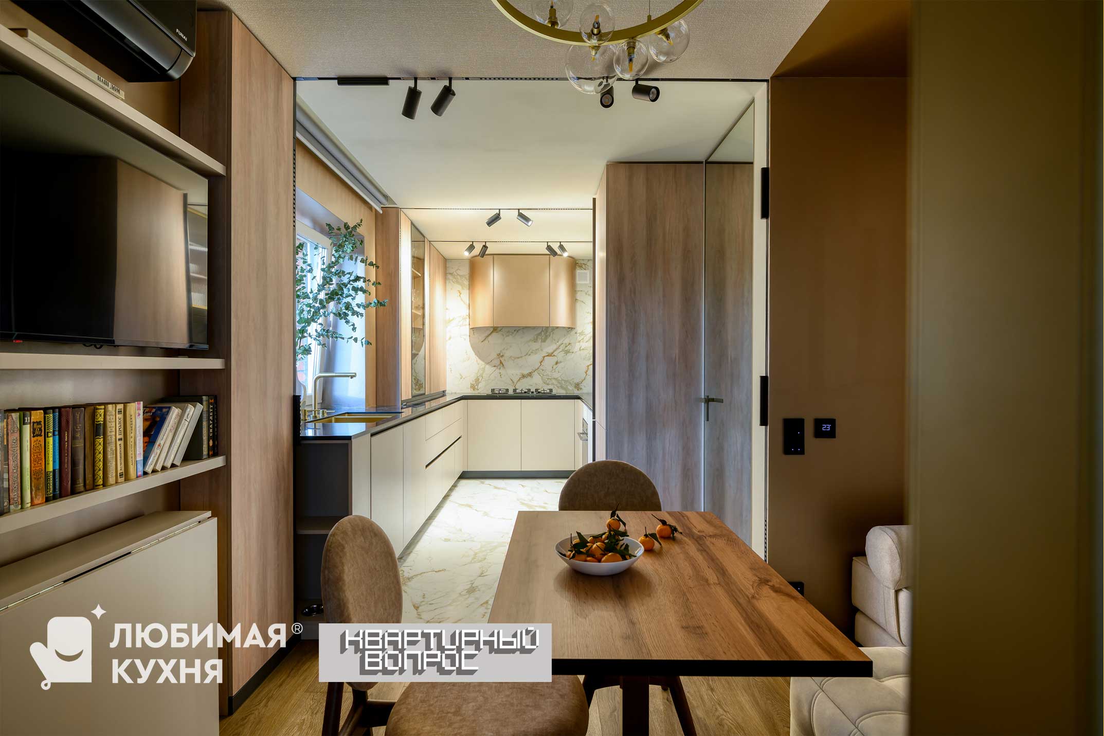 Масштабная переделка — затронула кухню, гостиную и коридор. В результате появилось единое пространство, в котором будет кухня станет удобнее и просторнее, а в гостиной – место для полноценной двуспальной кровати. Помогут нам в этом знание математики и архитектурное образование, немного магии и основательная работа со стенами и дверными проемами. А объединит комнату бежевый цвет, компанию которому составят мягкие полутона и контрастные акценты черного и белого цветов.