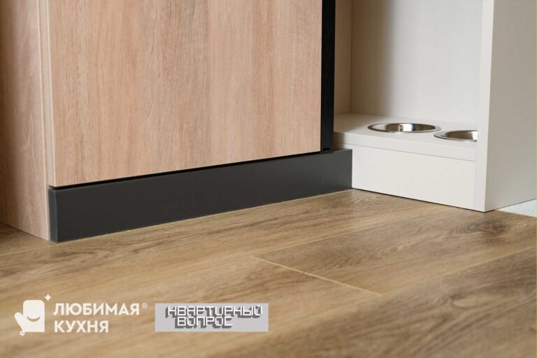 Часть нижних баз на кухне глубиной 40 см. Это позволит сэкономить пространство и уместить всю технику. Корпуса элементов – из ламинированной ДСП с пластиковой кромкой. Она надежно защищает от повреждений. Для тумб в качестве ручек используем удобный профиль Gola. Ящики гарнитура –полного выдвижения, с доводчиками. Распашные дверцы – с петлями легкого монтажа.