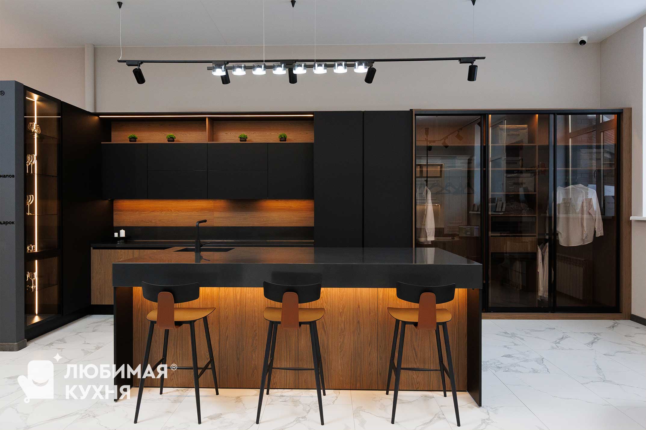 верх и пеналы фасады Mattelux Черный премиум, низ ЛДСП H1386 ST40 Дуб Кассела коричневый, витрины профиль алюминиевый ЧЕРНЫЙ ,стекло тонированое Графит
