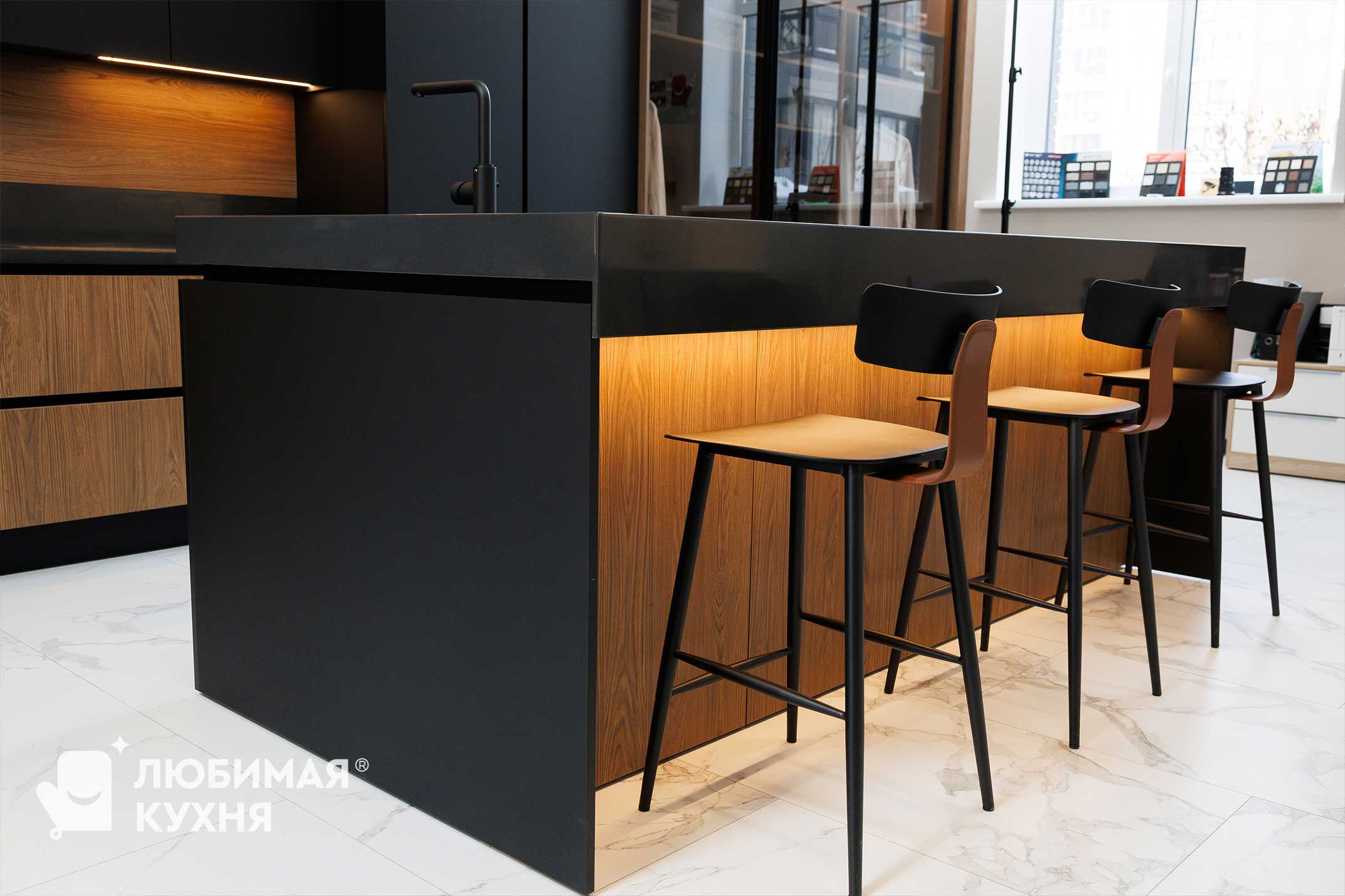 Кухня выполнена в современном минималистичном стиле с акцентом на контраст фактур и света. Матовые тёмные фасады сочетаются с тёплым древесным оттенком, создавая уютную и статусную атмосферу. Открытые ниши с декоративной подсветкой добавляют глубину и визуальную динамику, подчёркивая архитектурность композиции. Лаконичные формы и скрытые ручки делают интерьер строгим, стильным и функциональным.