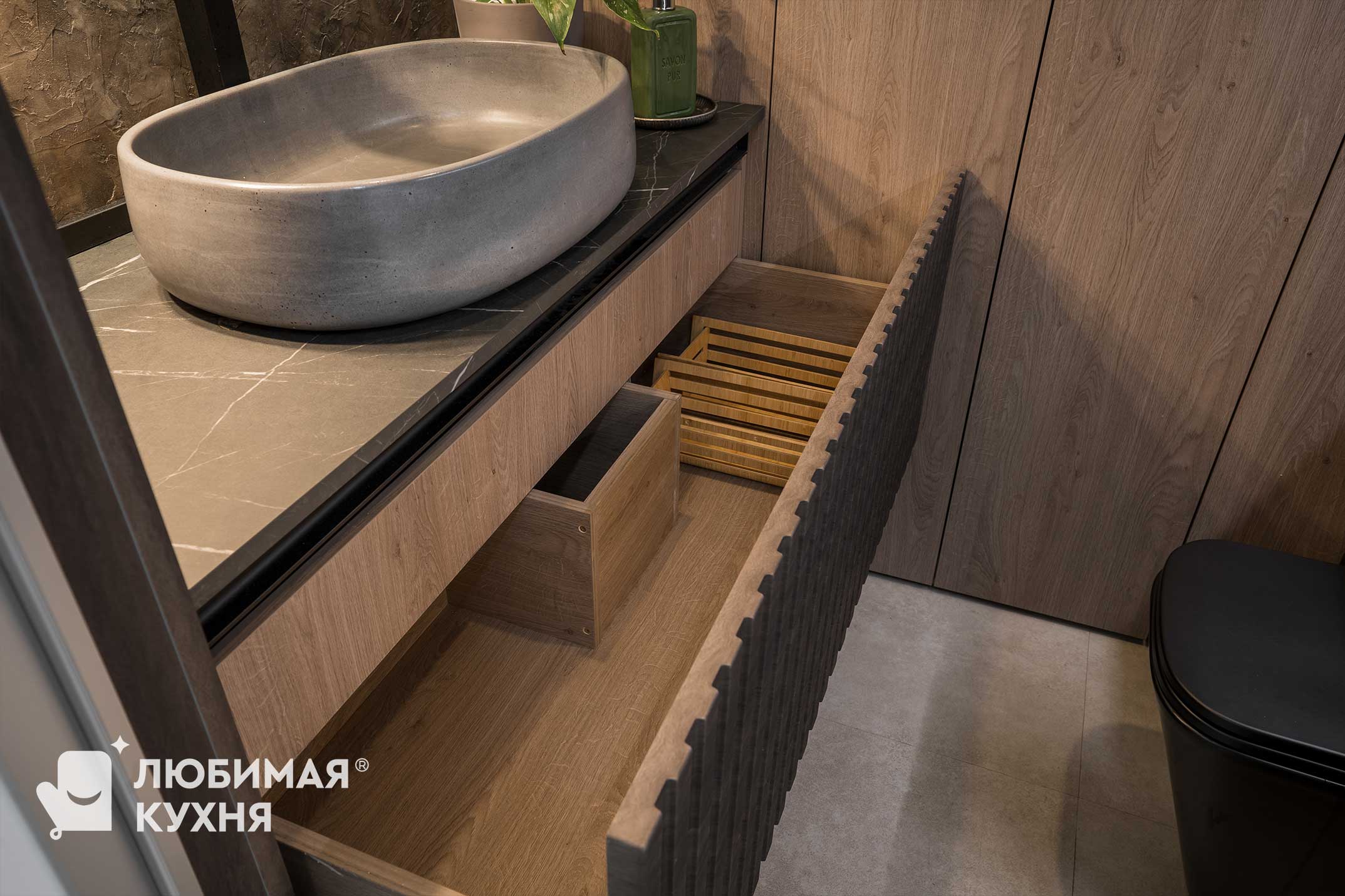 Брутальный санузел для любителей находится в уединении. Брутальная тумба с вместительными ящиками под раковину с металлической опорой и рифлеными фасадами плавно переходит в невероятно вместительные пеналы, в которых предусмотрены системы хранения. Над инсталляцией — полка с подсветкой и шкафом. Каждый сантиметр данного санузла использован по максимуму благодаря грамотной планировке.