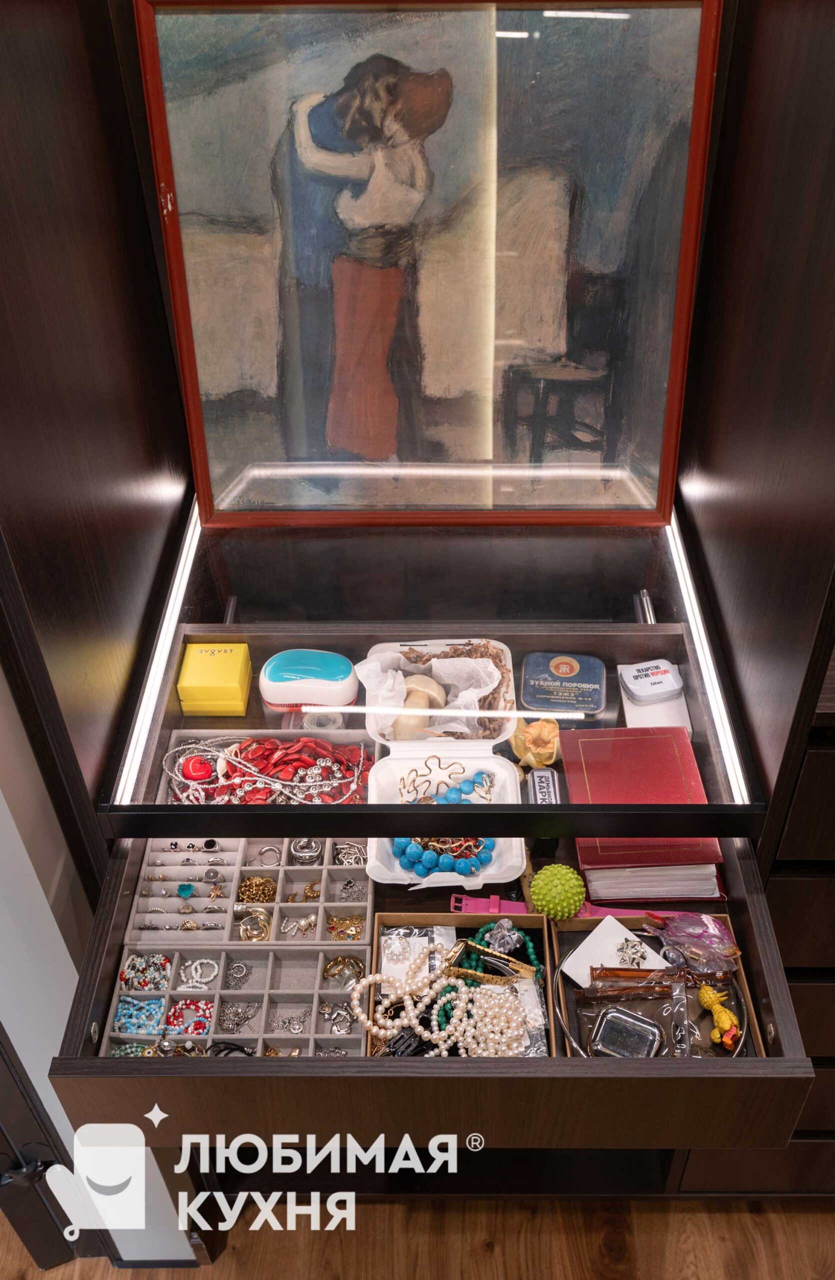 Искусство утонченного минимализма. Темные древесные фасады шкафов создают монолитное пространство, создающее впечатление кулуарного обволакивающего пространства. Гардеробная спроектирована с учетом гардероба заказчика, что позволяет использовать небольшое помещение по максимуму.