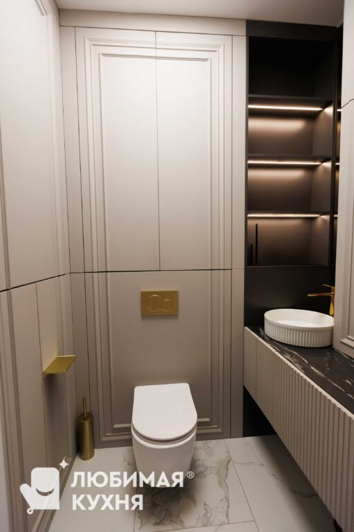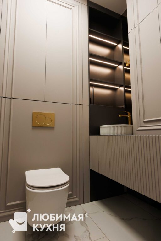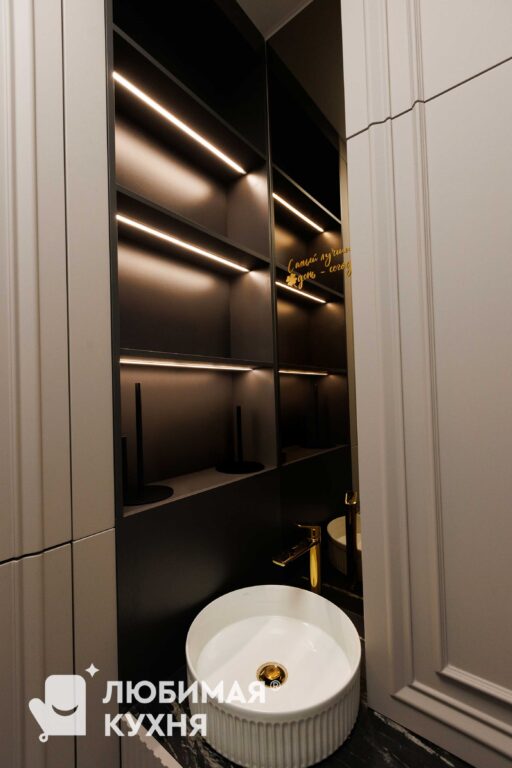 Функциональная мебель для постирочной в элегантном серо-юежевом оттенке с рифлеными фасадами. Компактная система объединяет зону стирки со встроенной стиральной машиной, открытые полки с подсветкой для хранения средств, выдвижной ящик и вешалку для сушки белья. Жалюзийные фасады на правой стороне обеспечивают вентиляцию, а золотистые ручки и фурнитура добавляют изысканности. Продуманное освещение делает пространство удобным для использования в любое время суток.