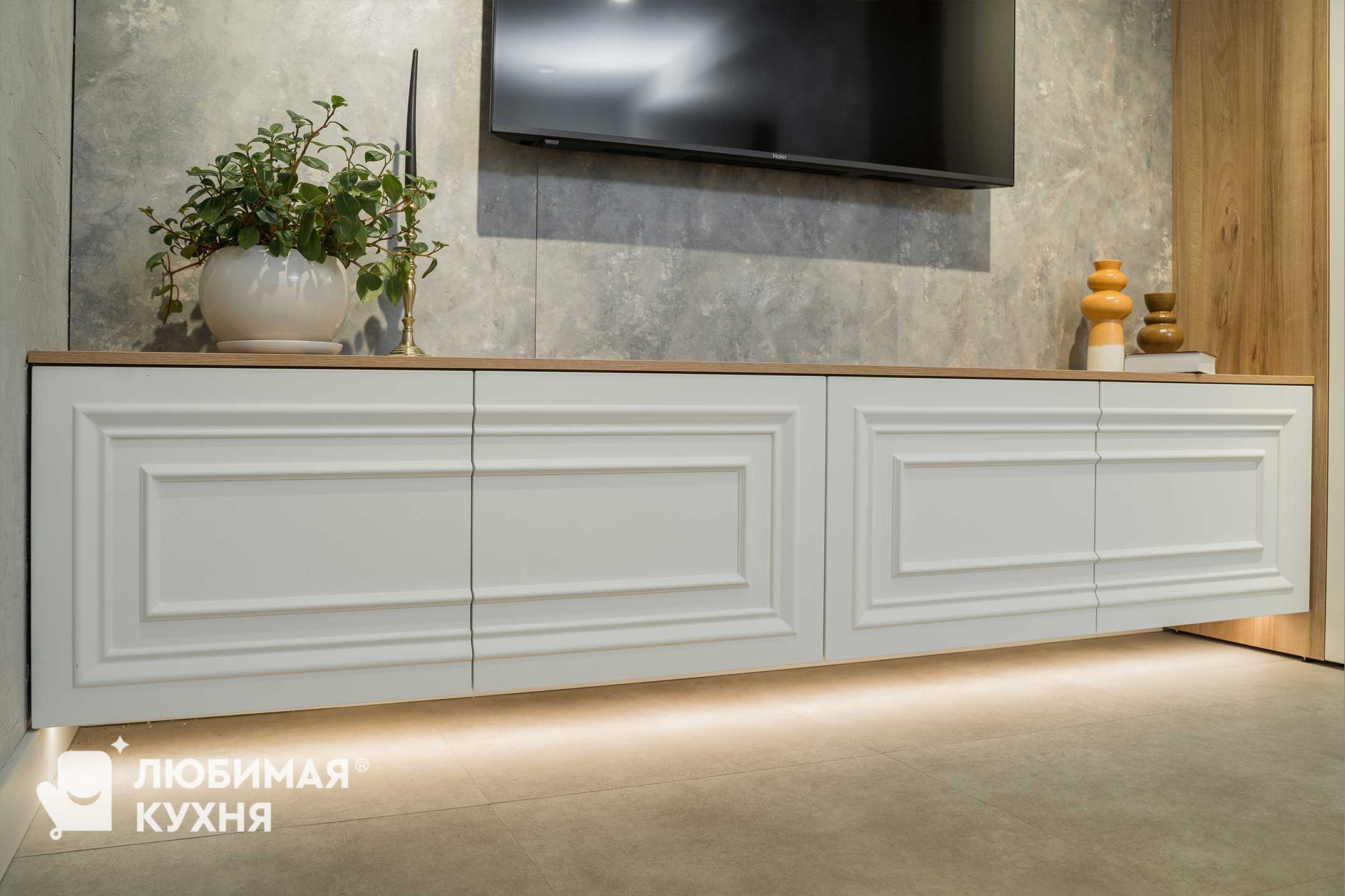 Мебель в гостиную в стиле неоклассика. Тумба с выдвижными ящиками и вместительные пеналы, торец которых декорирован полками с подсветкой. Изящное решение для вашей гостиной!