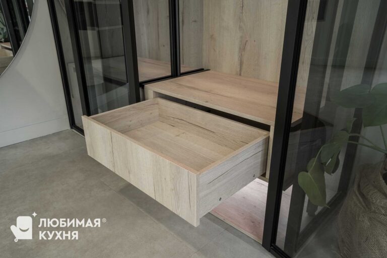 Комплект мебели в прихожую — подвесная тумба с зеркалом, стеновыми панелями и воздушным шкафом. Шкаф продуман для размещения верхней одежды на плечиках, а так же оборудован выдвижными ящиками. Подсветка обеспечивает отличный обзор всего содержимого, в таком шкафу вы не потеряете ни одну вещицу!